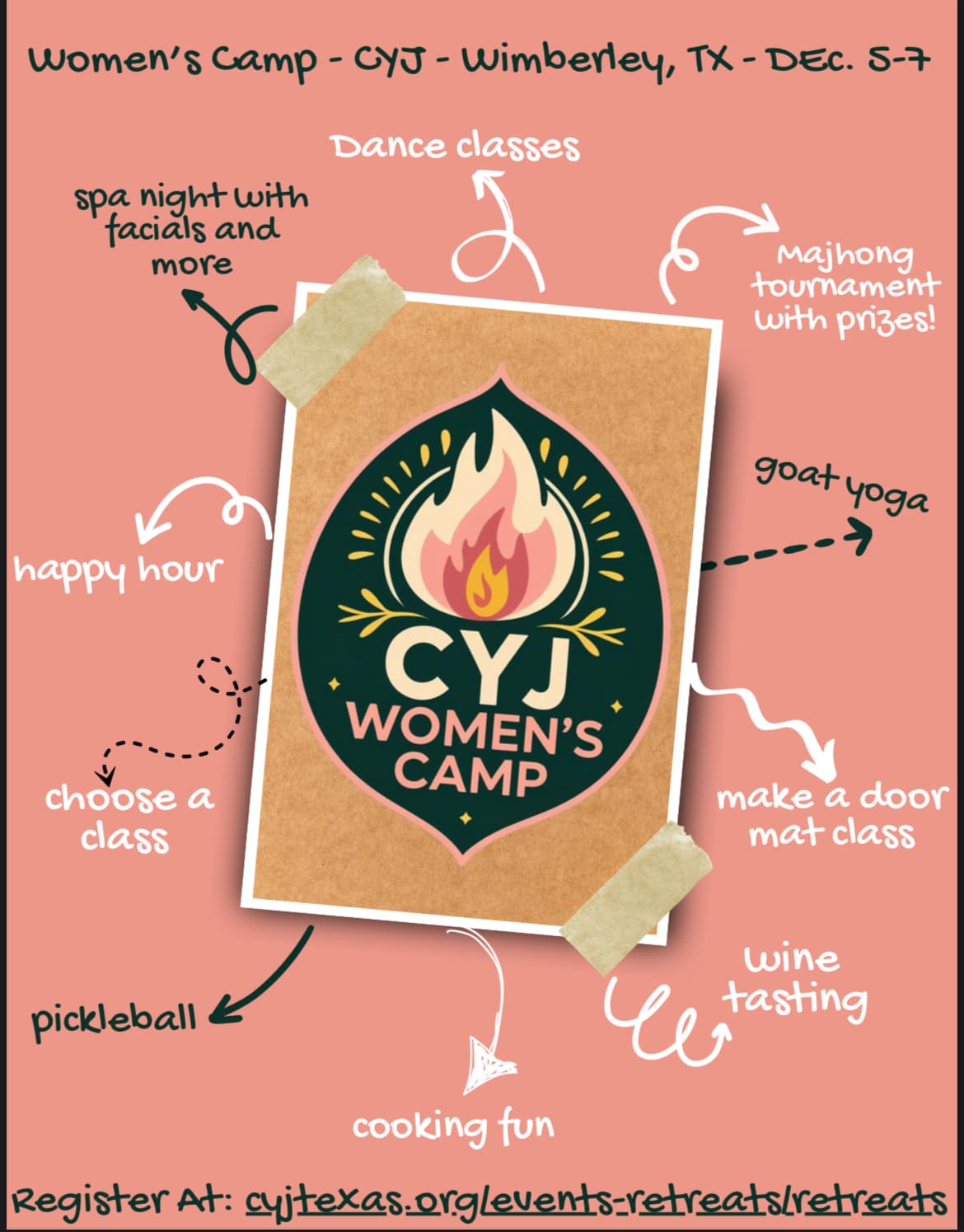 CYJ Women’s Camp is the ultimate getaway! Relax, recharge and connect with amazing ladies in a beautiful retreat center setting. Highlights include spa night with facials, goat yoga, dance classes, mahjong tournament with prizes, make your own doormat, wine tasting, cooking fun, pickleball, happy hour, choose your own adventure/class, and many more activities and opportunities....
