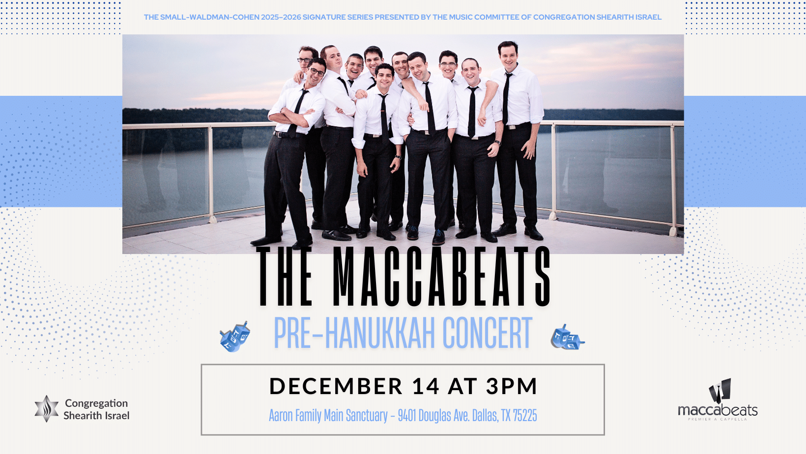 The Maccabeats Pre-Hanukkah Concert December 14 | 3pm Doors Open at 2:30pm Often traveling with little more than the shirts on their backs and the ties on their necks, The Maccabeats have entertained and inspired hundreds of audiences worldwide, from Alabama to New Zealand and everywhere in between. Using nothing more than the unadulterated human...