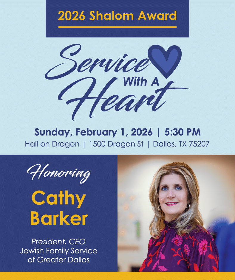 The Shalom Award is presented annually by the Temple Shalom Brotherhood to members of the community who have worked to better the lives of others through education, caring and philanthropy. This year’s honoree is Cathy Barker, CEO of Jewish Family Service of Greater Dallas, recognized for her tireless commitment to strengthening lives and building a more... |